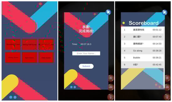 The mobile application used in the class was a gamified augmented reality system named XploreRAFE+ developed by the researchers. XploreRAFE+ utilizes the linked concepts of exploration in a real (R) environment to promote active (A) participation among learners in a fun (F) and engaging (E) lesson using augmented reality (signified by the + symbol). The system provided an AR map for students to search for trigger images which were positioned at different locations so that students could learn English in a realistic environment. At each location, learners were able to activate the AR images and videos by scanning their mobile phones on the trigger images provided at that location area, to understand the situation at each scene and perform some tasks that could stimulate their learning of English language skills, such as writing, speaking, reading, and listening. In addition, a leader board and a timer were incorporated to generate competitiveness among learners who needed to correctly accomplish their tasks at each location. A timer enabled bonus points to be allocated to groups that completed the tasks in a shorter period of time. A section for the learners to input their reflections at the end of each lesson in the form of video recordings was included in the system to extend learners’ interest and to sustain their motivation to practice their English language fluency by letting them relate to a real-life environment. The interface of the app is presented in Figure 5.