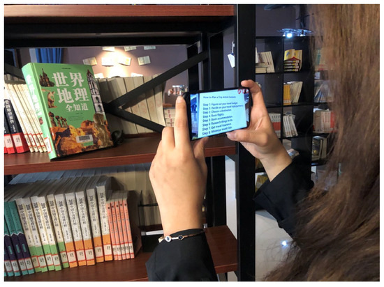 A library scene was selected as an example to present the gamified learning process in class. At the beginning of the English course, an AR map was provided, in which there were various learning scenarios, such as scenarios at a library, supermarket, clinic, dormitory, dining hall and gymnasium. The AR map was used as a course trigger marker. The students were divided into small learning groups. Each learning group used the application to scan the first scene they had selected in the AR map to obtain the sequence of learning scenarios. Once the students had received the reference books that provided an introduction to the app for the learning process in each scene with a basic description in English, the learning groups started the English lesson. The students would be “transported” to the scene of a library where they would first scan a marker, i.e., “AR English class,” to obtain a video regarding learning requirements and tasks for the library scenarios. They scanned a library card to obtain a relevant introduction in English regarding the library, and 3D books and its relevant information would then be displayed. Then, the students would go to the bookshelves to look for and scan the real books which were presented when scanning the library card. With each book that they scanned, they would be shown an AR image of the relevant content of the book; these would be the seed materials, including AR images, AR videos, AR audios, and a real physical environment. Figure 6 shows a student scanning the cover of a real book to acquire a relevant AR image in a library scene.