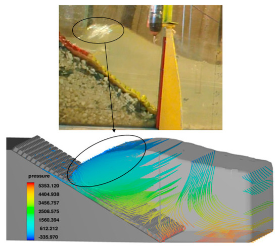 The wave run-down values on the coastal revetment must be determined in order to measure the length of the revetment layer beneath the sea surface. Additionally, wave run-down values are very important due to its effect on the up-lift force induced by onrush of water in the downward direction. The up-lift force on the waves often causes the armatures to be displaced or surge damaged. In the design of coastal protection armoring, the lowest possible value of 2% is used [29]. Figure 14 shows a sample from wave run-down in the laboratory flume and numerical modeling on the ACB Mat.