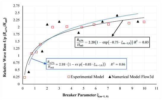 The wave run-up values were the relative run-up of the waves () and the height, period waves, and slope of the structure were the breaker parameter () based on dimensionless analysis. Figure 13 shows a comparison of the relative run-up values of the waves against the breaking wave parameter.
