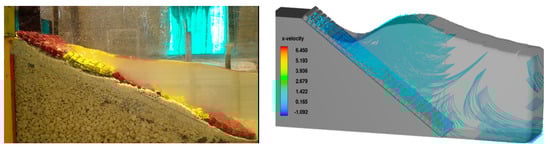 Localized deformations on revetment due to run-down and sliding of armor from body laboratory model (left) and numerical modeling (right).