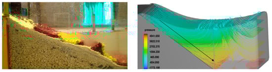 Wave overtopping on coastal structures is one of the most significant hydraulic reactions taken into account in the design of this type of structure. Wave overtopping occurs when the height of the structure is less than the maximum run-up (Rumax) value on the structure. The overtopping of waves is usually expressed as the overtopping discharge per unit width (). Figure 5 demonstrates the overtopping of waves on the concrete block mattress in both laboratory and numerical modes.