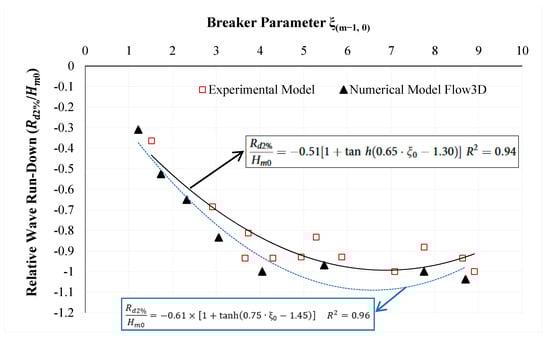 The primary reason for failure of the armor layer that is exposed to the wave attack is the hydraulic instability in which the armor is subjected to drag and uplift forces that cause crushing, displacement, and sliding. ACB Mat blocks owe their success largely to the connections of the armor, the porosity and the stability composition of each armor, and inertial mass. The most important goal of armor units is to balance hydraulic and structural stability and proper placement on the slope [33,34]. Maximum destabilizing forces appear at the wave trough; the risk of damage along the slope and the problem of armor placement in the required points should be assessed [35]. On the other hand, due to the pressure lines and the existence of negative velocities in the consecutive run-down, the downward flow force and the simultaneous weight component force provide the most instability conditions. At the moment of applying up-lift force and lifting the revetment from the body, the run-down forces and the weight of the blocks cause complete sliding from the body. There are two distinct probabilities for damage: either damage in the lower corner of the block or damage in the connection between each block. It should be noted that instability has occurred when the block reaches the point of negative stability [36]. The relative wave run-down values on the ACB Mat against the breaking wave parameter are shown in Figure 16.