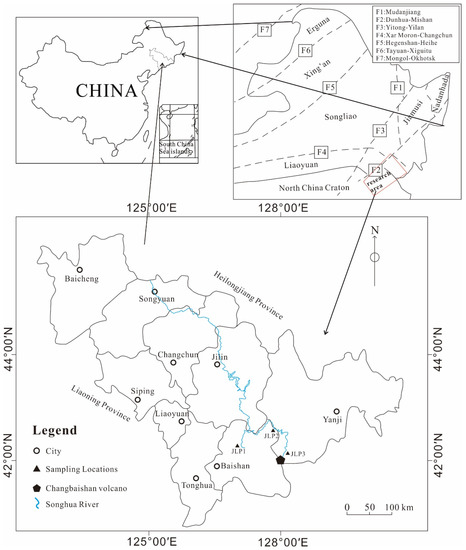 - Fan, Q.C.; Sui, J.L.; Wang, T.H.; Li, N.; Sun, Q. History of volcanic activity, magma evolution and eruptive mechanisms of the changbai volcanic province. Geol. J. China Univ. 2007, 13, 175–190. [Google Scholar]