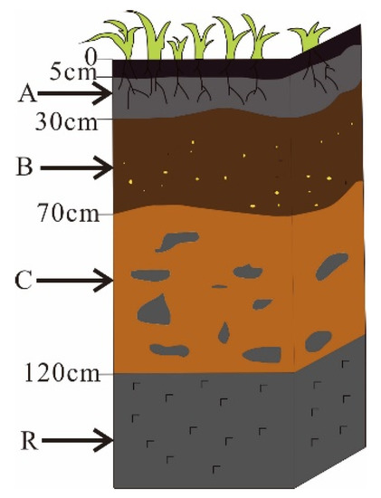 The study samples were taken from three well-developed basalt weathering profiles in the upper reaches of the Songhua River. The location of the soil profile is shown in Table 1. After discarding the humus layer, the weathering profile is divided into four layers from top to bottom, with an average depth of 1.5 m. The different horizons in Figure 2 are called horizons A, B, C, and R. Layer A is the leaching layer: sampling depth is about 5~30 cm; soil in this layer is dark and rich in organic matters. Layer B is the sedimentary layer: sampling depth is about 30~70 cm; soil in this layer is brown and rich in organic matters and microconglomerate. Layer C is the parent material layer: sampling depth is about 70~120 cm; soil in this layer is light brown, containing massive weathering rocks and residual debris. Layer R is parent rock: grey vesiculate basalt of this layer was collected from depths of 120~150 cm.