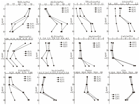 With the formation of new mineral assemblage after rock fracture, the main elements of basalt in the study area experienced the process of desalting basement-enrichment of SiO2 and Al2O3 from parent rock to parent material layer in the early stage of weathering (except silicon and aluminum, other main elements were leached in varying degrees; Table 2; Figure 3). In the profiles JLP2, the concentrations of SiO2 and Al2O3 in parent rocks are 51.77% and 19.20%, while they are 56.12% and 21.24% in the parent material layer. In the profiles JLP3, the concentrations of SiO2 and Al2O3 in parent rocks are 53.23% and 15.96%, while they are 63.07% and 17.74% in parent material layer. From the parent material layer to the sedimentary layer, weathering experienced silicon enrichment and dealumination (except silicon, other main elements were leached, in which aluminum leaching was strong). In the highest stage of weathering, except manganese, the behavior of other elements from sedimentary layer to leaching layer tends to be stable. Due to acid leaching, Mn is relatively enriched in the leaching layer. Among the three groups of basalt weathering profiles, the change trend of main elements in JLP3 profile is slower than that in the other two groups, suggesting that higher altitude will lead to weaker weathering degree.