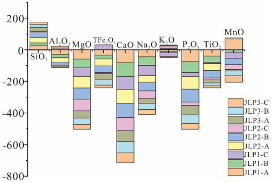 According to the above weathering index calculation, the parent rock weathering degree of the three sections is low. Therefore, the element mobility M = 100 can be determined × (The enrichment or leaching rates of elements in different profiles are calculated by RI-RP/RP) formula. In the same section, RI represents the X element content in weathered samples, and RP represents the X element content of parent rock samples. In the parent material layer, sedimentary layer, and leaching layer of the three sections, the cumulative mobility of SiO2 is the highest (Figure 4), indicating its enrichment characteristics in the weathering process, while other elements are leached in the weathering process. The average values of Cao element mobility in layers A, B, and C are −0.79, −0.83, and −0.74, respectively, indicating that Cao is most seriously lost during weathering (Table 6; Figure 3). K2O mobility fluctuates the least, and the average value of the three profiles is 0, indicating that its mobility is the smallest and most stable in the weathering process, and the stability of Al2O3 and TiO2 is second only to K2O.