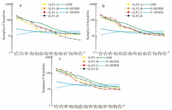 Chondrite normalized distribution model of the REE in the soil profile. Chondrite, OIB, E-MORB, and N-MORB reference values after [47]. Panel (a) is the chondrite normalized distribution model of the REE in soil profile 1. Panel (b) is the chondrite normalized distribution model of the REE in soil profile 2. Panel (c) is the chondrite normalized distribution model of the REE in soil profile 3.