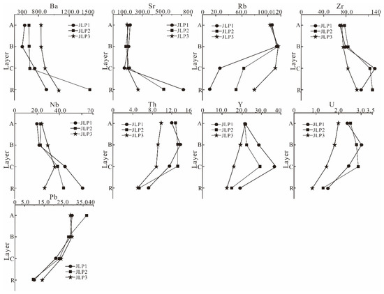 Large ion lithophile elements (LILE, Ba, Sr, Rb, K) can form independent minerals and are soluble in water. Their chemical properties are active and easy to move after weathering. At the initial stage of weathering, Ba and Sr in the study area are largely lost from the parent rock to the parent metal layer. With the deepening of weathering, their contents are gradually stable. The content of Ba in the parent rock is 2.44 times the background value; the content of leaching layer is 1.52 times of the background value; and Rb is enriched with weathering (Figure 6). K is most stable during weathering (Figure 3).