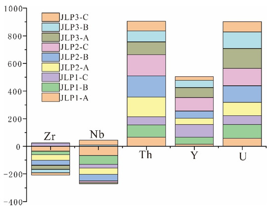 High field strength elements (HFSE, Zr, Nb, Th, Y, U) generally have stable chemical properties, high electricity price, ion field strength, and small radius and are generally immobile during geological processes such as metamorphism and different types of alteration, including weathering. Therefore, they are usually used to restore the original properties of rocks after later changes. During weathering, five high field strength elements in the study area show different behaviors. Zr and Nb are leached; the average movement of Zr is the smallest; all tested high field strength elements are relatively stable, while Th, Y, and U are slightly enriched, among which the average movements of Th and U are the largest and most unstable among all tested high field strength elements (Figure 7).