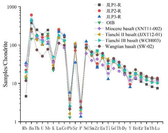 Trace element spider diagram. Chondrite and OIB reference values after [48]. XNT11-002, JJXT12-01, WCH003, and SW-02 reference values after [48].