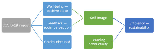 Figure 1 summarizes the key research terms. Well-being and feedback reflect the person’s self-image, and the grades obtained in the semester assessment are an indicator of personal efficiency in learning, as well as the sustainability of the university education system.