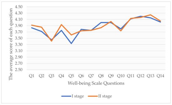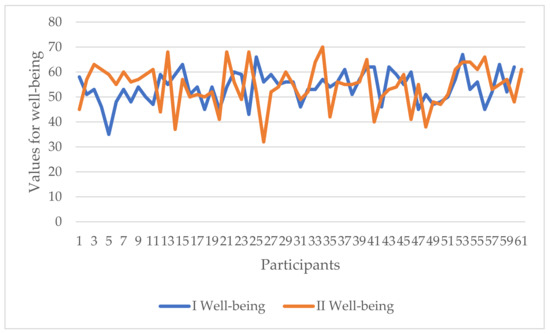 In stage II of the testing, the average value of the students’ well-being was 54.4.