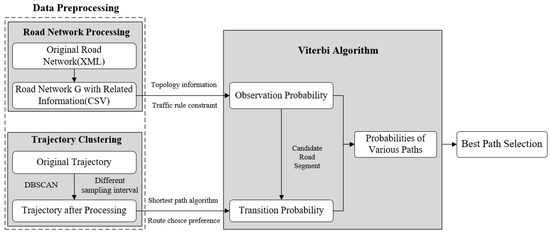 The proposed algorithm is designed to select the best matched road segment for each GPS trajectory point. Figure 1 shows the architecture of our algorithm, which consists of two parts: data preprocessing and the construction of HMM.