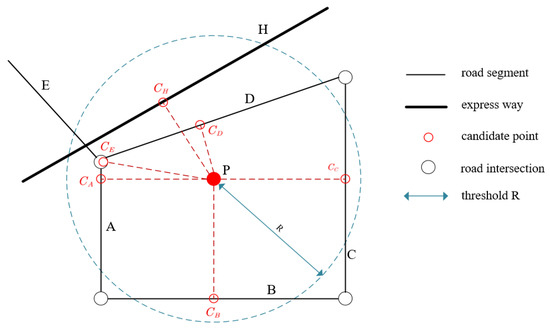 - For a threshold value , set the road segments within the proximity of observation as the candidate links, as shown in Figure 2. Then, the observation probability for each candidate link is calculated;
