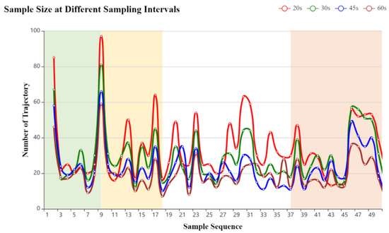 - In Figure 8b, the HMM algorithm has the smallest ATC for all four sampling intervals and the longest average time consumed by the SPM algorithm. On the other hand, when the sampling interval is greater than 30 s, the proposed algorithm and the HMM algorithm generate relatively stable ATC, while the ATC of the SPM algorithm gradually increases.