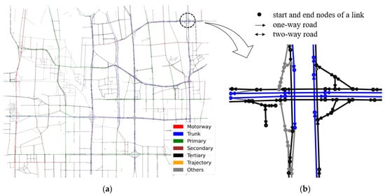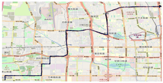 The selected road network contains 10,545 road segments and 9188 points. Apart from the linking sections, the average length of road segment is 91.54 m. Figure 4 presents the actual scene of the experiment and the display of the original trajectory data on the map of this paper. Figure 5 shows the basic structure of the road network that we extracted.
