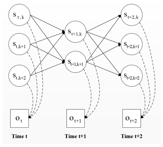 Figure 6 illustrates the model used. For a hidden state point at time step , we can obtain the corresponding observation point with observation probability . This state point could transfer to the next hidden state point with a transition probability . At first, it should have an initial state , which denotes the probabilities of being in various states of the start time. Transition probability A, observation probability B and initial state probability vector are called the three elements in HMM [18].