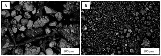 Although the peat grains exhibited greater sphericity, the compost was formed by particles of different shapes (spherical to elongated), including some that resembled compostable materials that are more difficult to degrade (such as sawdust) (Figure 1 and Figure 2). The compost exhibited an irregular structure, with some smoother particles and rougher particles, which can contribute to greater porosity in relation to peat (Figure 2A,B).