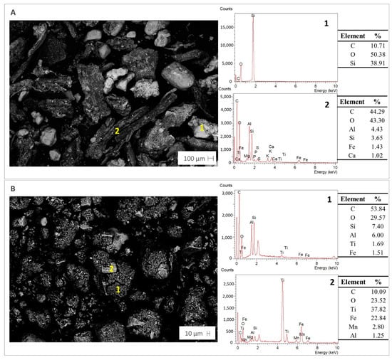 The surface examination using EDS associated with SEM is illustrated in Figure 2. The results of the elementary analysis of EDS showed that C, O, Si, Al, and Fe were the main elements in the structure of both materials; however, the intensity was different, which confirms the data in Table 1 (elemental composition and XRF). For compost, Point 1 exhibited large concentrations of O and Si, possibly indicating the presence of quartz. Point 2, on the other hand, revealed an intense concentration of C combined with inorganic components (e.g., Al, Si, Fe, and Ca), probably indicating an aggregate of organic and inorganic matter (Figure 2A). For peat, Point 1 had a high C content, although inorganic elements (e.g., Si, Al, Ti, and Fe) were also present. In Point 2, the presence of C was lower due to the increase in the levels of inorganic constituents (mainly Ti and Fe). Thus, the samples illustrate an association between organic and inorganic plots typical of this material typology. In other words, peat is predominantly made up of inorganic portions coated with organic matter.