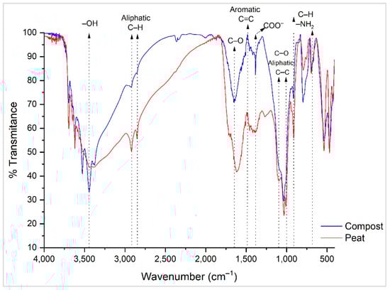 The subsequent appearance of two bands for peat (located at 2923 and 2846 cm−1) and one band for compost (at 2923 cm−1) might be attributed to the asymmetric and symmetrical stretching of the C–H group of long-chain aliphatic components.