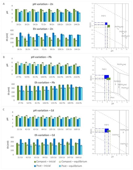 Initial and final pH and Eh values for compost and peat contaminated with Zn (A), Pb (B) and Cd (C). Each result is the mean ± standard deviation (vertical lines) for triplicate experiments (data entered in Brookins diagrams []).