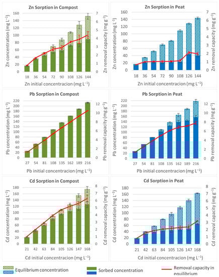 The influence of different concentrations on the sorption of Zn, Pb and Cd by the compost and peat was tested, and the trends are illustrated in Figure 5. Comparing the sorbed concentration to the initial concentration, the highest percentage of removal was observed at the lowest concentrations, with removal values close to 100%. However, for the highest concentrations, the order of removal was Pb > Cd > Zn for compost and peat. Several mechanisms act on the sorption of PTE, but each does not attract different ions equally. Thus, an important factor in the evaluation of sorption is the affinity of each PTE for the sorbent [].