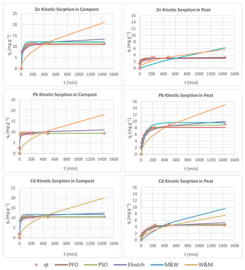 Determining the sorption kinetics are important for understanding the metallic ion removal process using sorbents. Thus, the data can be well understood by examining kinetic models and determining the rate-controlling mechanism. Kinetic batch experiments were conducted based on and adapted to the methodology used by []. This test was initiated in duplicate using a similar ratio of equilibrium experiments (1:50), but mixing 5 g of solid material (peat or compost) with 250 mL of a single solution with a PTE concentration of 220 mg L−1 (solid:solution ratio of 1:50). The mixtures were maintained under the same stable room temperature (close to 25 °C) and 10 to 20% mechanical stirring. After each time interval (0, 15, 30, 60, 90, 120, 150, 180, 210, 240, 480, and 1440 min), an aliquot of the suspension was collected and filtered and the filtrate was analyzed for the remaining PTE concentrations using a PinAAcle 900F Atomic Absorption Spectrophotometer (PerkinElmer).