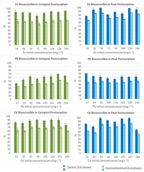 For mining wastes, Ruby et al. [] indicate that these in vitro methods may represent an effective tool in geochemical and physiological evaluations for the control of PTE accessibility to the human body. Thus, PTE bioaccessibility is widely used in the assessment of mining waste-contaminated soils, including abandoned mining and smelter sites [,,,,]. Conversely, limited research has focused on whether performing soil organic amendments by increasing the organic carbon provides significant protection against PTE sorption for exposed individuals [,,]. In addition, few studies in the literature have presented the results of PTE bioaccessibility in sorbents, such as peat and compost.