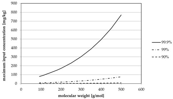 A reversed approach seems to be more suitable for the safety evaluation of chemical recycling processes. Within this approach, cleaning efficiencies are not applied to a fixed input contamination level. Instead, the concentration in a PET mineral water bottle was calculated, which corresponded to a migration level of 0.1 µg/L after storage for 365 d at 25 °C. This migration level as well as the storage conditions had been used for the evaluation of mechanically recycled PET by EFSA []. These maximum concentrations in the PET bottle were calculated for the substances typically used in challenge test, but also for other substances with defined molecular weights up to 1000 g/mol. The results of the maximum bottle wall concentrations corresponding with a migration level of 0.1 µg/L after storage for 365 d at 25 °C are given in Table 3. On the first approach, these maximum concentrations in the bottle wall were calculated without consideration of any cleaning efficiencies of the depolymerisation and repolymerisation process. This means that the pure migration process had been considered in the concentration given in Table 3. Assuming cleaning efficiencies of 90%, 99%, and 99.9% the maximum concentrations for each increased by a factor of 10, 100, and 1000, respectively (Table 3, Figure 1).