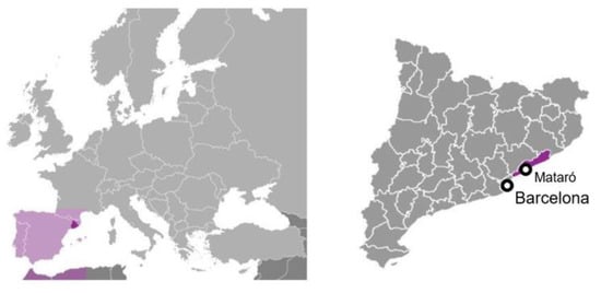 Location of Mataró (left) in southwestern Europe and (right) in Catalonia.