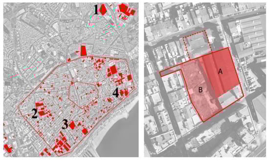Left: urban gaps in Mataró at the time (2013–2014) the project moved to Can Fugarolas site (4), indicating its former locations (1. La Fibra/2. Can Fabregas i Caralt/3. Can Fabregas de Paper). The Casc Antic (old town) and Plan de Ensanche (Grid Plan, 1878) areas are indicated. Right: delimitation of the urban planning sector (red line) and subsequent extension (dotted red line), as well as the CanFugarolas project area (shadowed in red), identifying the building (A) and the playground (B).