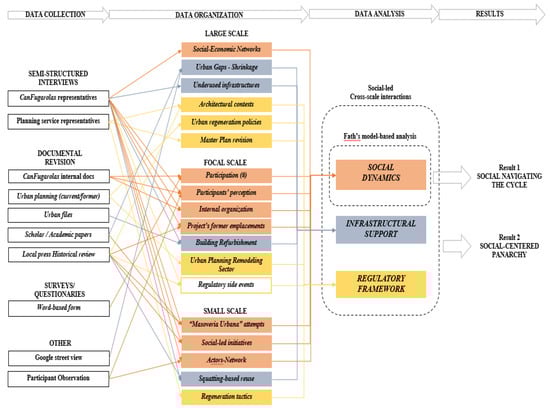 Subsequently, the chronological and geographical organization of the events allowed a description of the adaptive cycle at each of the subsystems, as well as the identification of cross-scale interactions between the subsystems observed; this provides evidence of Fath-based social resilience as well as social-centered panarchy. Figure 3 shows the progression of the research path, from data collection to the final results.