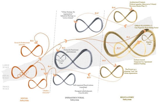 Social navigating also allows the formal reorganization at the Infrastructural Subsystem (e.g., refurbishment of the physical support). Indeed, the progression at the Social Subsystem translates into a formal and functional reactivation of misused infrastructures, both at the Focal (Rv3 in Figure 5) scale (CanFugarolas’ building) and Small (Rv3′ in Fig5) scales (squatting). Here, two community-led crowdfunding campaigns appear as an expression of social innovation capacity for urban progression.
