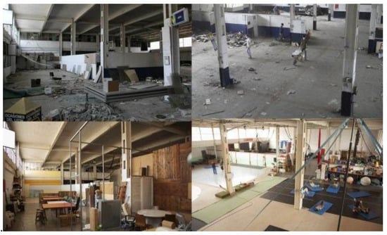 The building (Focal scale) was vacated in 2002 because of deindustrialization dynamics. According to the files, during the former period (1963–2002) it was devoted to being a car repair workshop and was not subject to any major formal transformations until its abandonment. Afterwards, Rigidity Trap appears in terms of its incapacity to maintain the former car-repairing activity it was specifically designed for in the face of new planning (PGM96) disposals. Here, specialization of its seminal design became a major obstacle for adaptation. Afterwards, dismantling and the relocation of the facilities and industrial equipment to another location along with more than 10 years of inactivity (2002–2013), irregular use and vandalism actions resulted in impoverishment and the decay (Dissolution Trap) of spatial-formal conditions. Hence, by the time prior to the entrance to the building, the Poverty Trap is evidenced as the system cannot access enough activation energy to reach a state where positive feedback drives growth internally [].