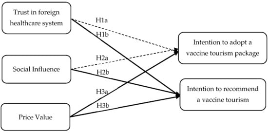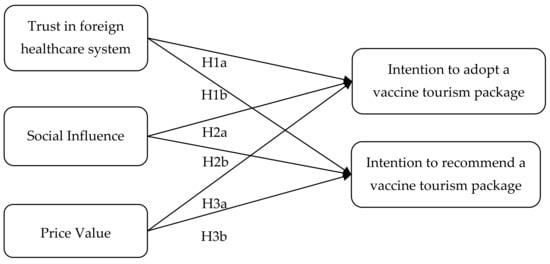 Social media has become one of the main channels people use to search for travel information []. As mainstream social media users, young tourists often use social media, including online discussion forums, to look for information, exchange opinions, and read online reviews. Thus, social networks could shape their perception and understanding of the benefits and drawbacks of participating in vaccine tourism. Sahli and Legohérel [] found that social influences are essential in forming consumer intention to book tourism packages online. We, therefore, hypothesize that social influence could have a positive impact on vaccine tourism adoption and recommendation. We propose the following: