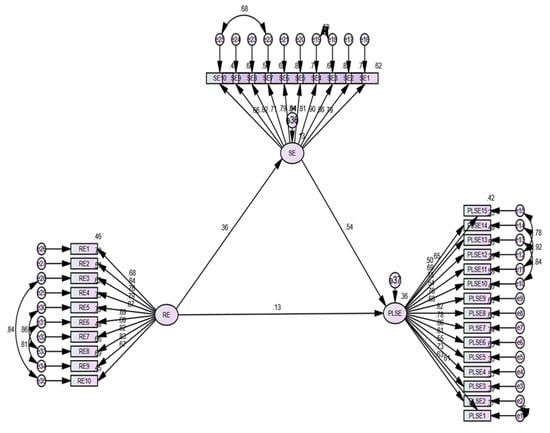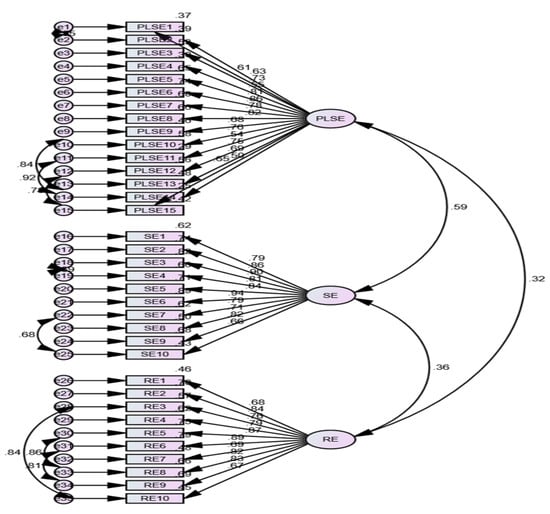 Correlation coefficients among RE, SE, and PLSE were also estimated, as reported in Table 5. The values of Pearson’s correlations among the constructs should be between ±1 []. Correlation values greater than 0.80 are considered high and are treated as a multicollinearity issue. Correlation values greater than 0.20 and less than 0.80 are considered moderate and reasonable, while correlation values less than 0.20 are considered low [,]. The correlation table indicates that there is moderate relationship among the constructs, as the correlation between SE and RE (0.374), SE and PLSE (0.345), and RE and PLSE (0.620) are all statistically significant.