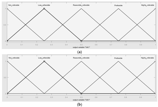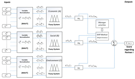 Through the attributes previously defined, and by using fuzzy logic techniques, the correspondent value functions , , and were achieved, regarding each sustainability dimension. Then, and by using an additive model based on the MAVT approach, a unique expression to aggregate all dimensions was achieved, in order to assess each alternative/potential partner. This function was then weighed by a weight factor , expressing, thus, the relative importance given to each dimension of sustainability, resulting, therefore, in the final assessment function, i.e.,: