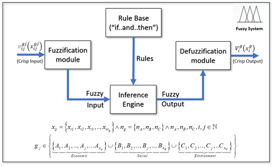 A fuzzy-logic-based system can be applied to decision-making problems, by providing a formal methodology, which allows for the representation, manipulation, and implementation of human heuristic knowledge, regarding how to support the decision agent when it is asked to perform smart decisions (e.g., [9]). Each one of the fuzzy systems presented in Figure 3 can be represented by a block diagram, such as the one shown in Figure 4.