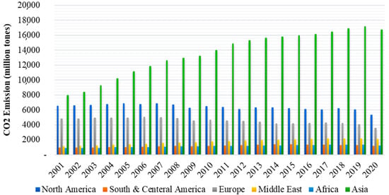 Concerning such environmental damages, actions such as the Paris Agreement (2016) compel all countries to reduce emissions to some extent, while also contemplating methods and policies to assist humanity in the adaptation to changes in climate. Consequently, the causal factors of emissions, particularly carbon emissions, have piqued the interest of scholars, with evidence pointing to population increase [1], energy utilization [1,2], human resources [3], urban growth [4], trade openness [5], financial sector growth [6]), natural resource rent [7], and research and development [8] as the crucial factors of carbon emission, among others. Carbon emissions reductions are advantageous because they have addressed an urgent worldwide challenge of reducing environmental deterioration, which has an impact on human growth and well-being. Constraining economic activity, in contrast, is unsustainable in the long-term. As a result, it begs the question of whether policymakers could combine growth strategies with low-carbon plans to assure that society’s growth is optimum, effective, and long-term. Figure 1 below shows the Asian region as the top emitter in the world for the last two decades, recording 16778 million metric tons CO2 emissions in 2020, whereas North America and Europe remain the second and third largest emitting regions, respectively.