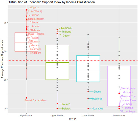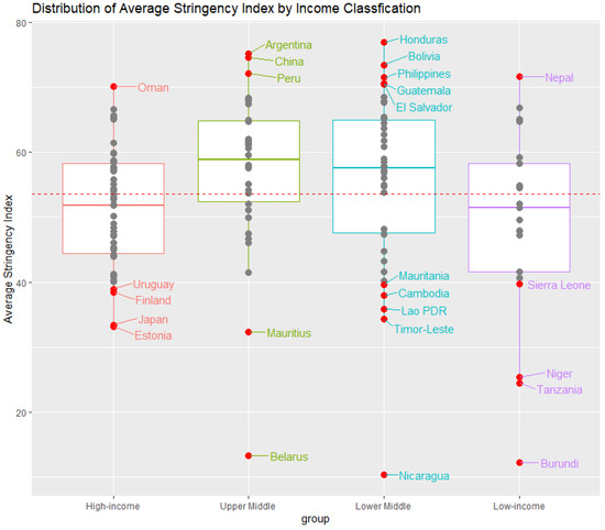 The extent to which COVID-19 tolls vary by country is dependant on the overall effectiveness of countries’ policies towards COVID-19 management. In the different time periods of the COVID-19 outbreak, countries have applied various policies to control COVID-19 infections and mortality. To track such policies, ref. [3] developed the Oxford COVID-19 Government Response Tracker (OxCGRT). This provides a standardized methodology to assess the various government policies on COVID-19. It systematically collects information on several different common policy responses that governments have taken to respond to the pandemic on 18 indicators such as school closures and travel restrictions and covers more than 180 countries. We only focus on two of the indices, the stringency index and the economic support index. The stringency index includes school closures, workplace closing, cancelled public events, restrictions on gatherings, public transportation, stay at home orders, restrictions on internal movement, international travel controls, and public information campaigns. The economic support index covers income support and debt/contract relief for households.