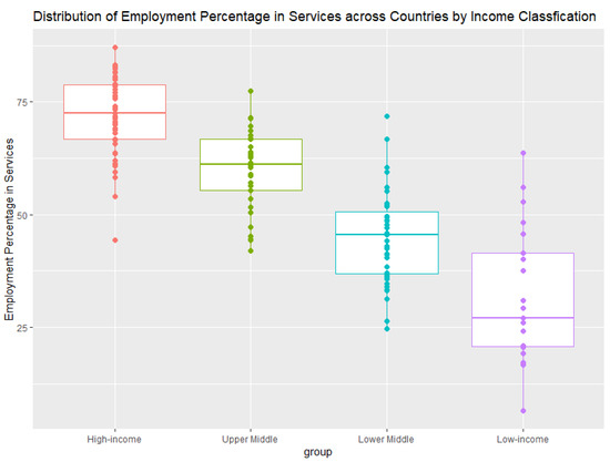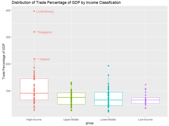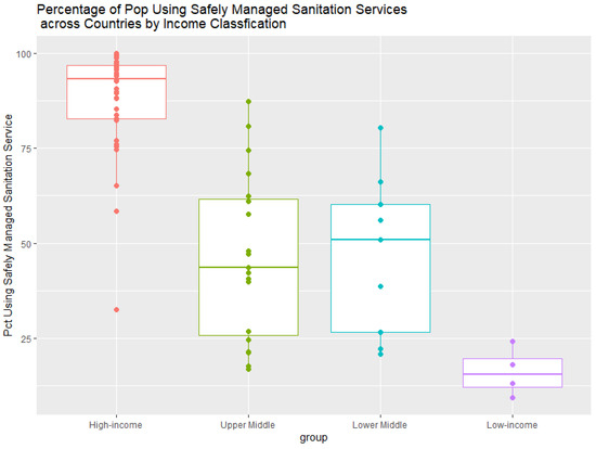 Figure 5 provides the percentage of international trade to GDP. Similarly, we can see that such a share is bigger in high-income countries than their counterparts. Figure 6 shows the percentage of the population covered with safely managed sanitation services by income classifications. It shows that countries with economic advantages have higher coverage than those countries with lower income.