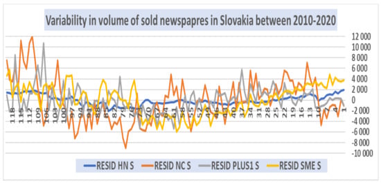 Variability in time series is a typical part of them and reflects the natural development of the monitored process. In the situation, as observed by us, the variability was reflected both in the trend decrease in the volume of journals sold and in the inter-monthly changes in the sales volume of the daily newspaper. When analyzing, we were interested in both components of the time series, with attention required by their extreme values—both in the decrease and in the increase in sales. According to Table 5, the highest monthly decrease was recorded by the NC newspaper, namely, 9062 pieces. The maximum inter-monthly increase was also recorded by the daily NC with 12,058 newspapers sold. Extreme changes in sales volume deserve a deeper marketing analysis.