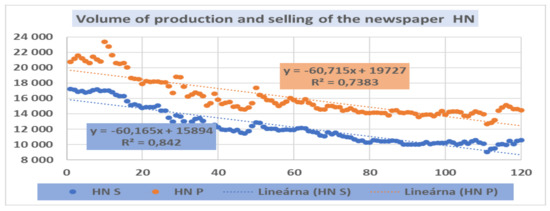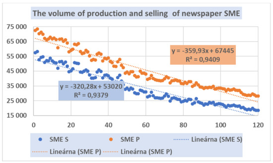 The last monitored journal was the SME. Figure 6 shows the strong decreasing trend in its volumes of printed and sold newspapers, with relatively low variability. Its regression functions for printing and selling volumes were as follows: