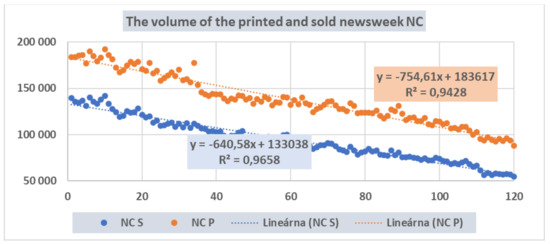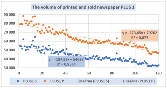 From the graphical presentation (Graph 1), we can deduce the linear decrease in production volume as well as sales volume in the case of all selected newspapers. However, for more detailed knowledge of the time series representing individual newspapers, we used the linear regression function, with the dependent variable Ptj, and/or Stj. As an independent variable, we considered the time factor t. In our case, we approximated this value with the code of the evaluated month. We formally expressed the volume of production and/or sales of newspaper as a function of the time variable t. The estimated printed volume, Pj, is given by