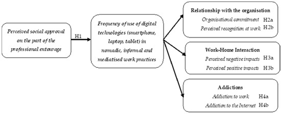 Few studies have established a link between perceived social approval on the part of the employees’ professional entourage and the adjustment of their remote and mediatised work practices. Some studies do, however, demonstrate that the adoption of telework depends in particular on the employees’ desire to be more present to meet the needs of their families and friends [24,25]. Moreover, some other studies [26,27] specify that remote workers tend to develop specific behaviours in the context of their professional practices, such as the more frequent use of emails or telephone calls, in order to remain visible to their professional entourage.