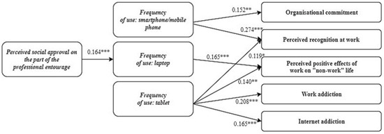 Firstly, we find that perceived social approval on the part of the professional entourage tends to favour more frequent use of the laptop in the context of nomadic and informal work practices. On the other hand, our results do not indicate any significant links between perceived approval and the frequency of use of the other two technologies (smartphone and tablet). Similarly, there are only indirect links between social approval and all the processes examined, links that are totally mediatised by the frequency of laptop use.