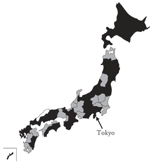Geographical distribution of preference for compact Olympics. Note: Black shaded areas indicate prefectures where the percentage of residents who preferred small-scale Olympics is over 65%. Gray shaded areas show prefectures where the percentage is between 50% and 64%. The white area is a prefecture (Shimane) where the percentage is below 49%.