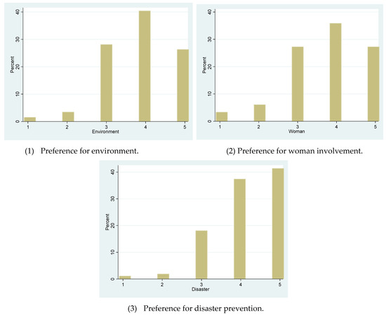 Figure 3(1)–(3) shows the distributions of VIEW ENVIRONMENT, VIEW GENDER, and VIEW DISAST. Similar to Figure 1, the majority support the argument that the government should contribute to environmental protection, gender equality, and enhanced disaster prevention. In particular, natural disasters occur frequently in Japan. In response, awareness of disaster risk management has grown [23,24]. The Japanese strongly support government engagement in disaster prevention.