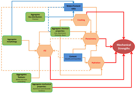 The different physicochemical parameters of the aggregates in connection with those of the other materials present in the concrete as well as the formulation of the cementitious materials influence the physicochemical properties of the latter and thus their mechanical properties. While being aware that it is not always easy to highlight the specific effects of the aggregates on the properties of the cementitious materials, an overview is provided in Figure 1 with an indication of the potential influential parameters of SCFS. The arrows are oriented from the potential influential parameters of the aggregates to the properties or parameters of the cementitious materials likely to be impacted.